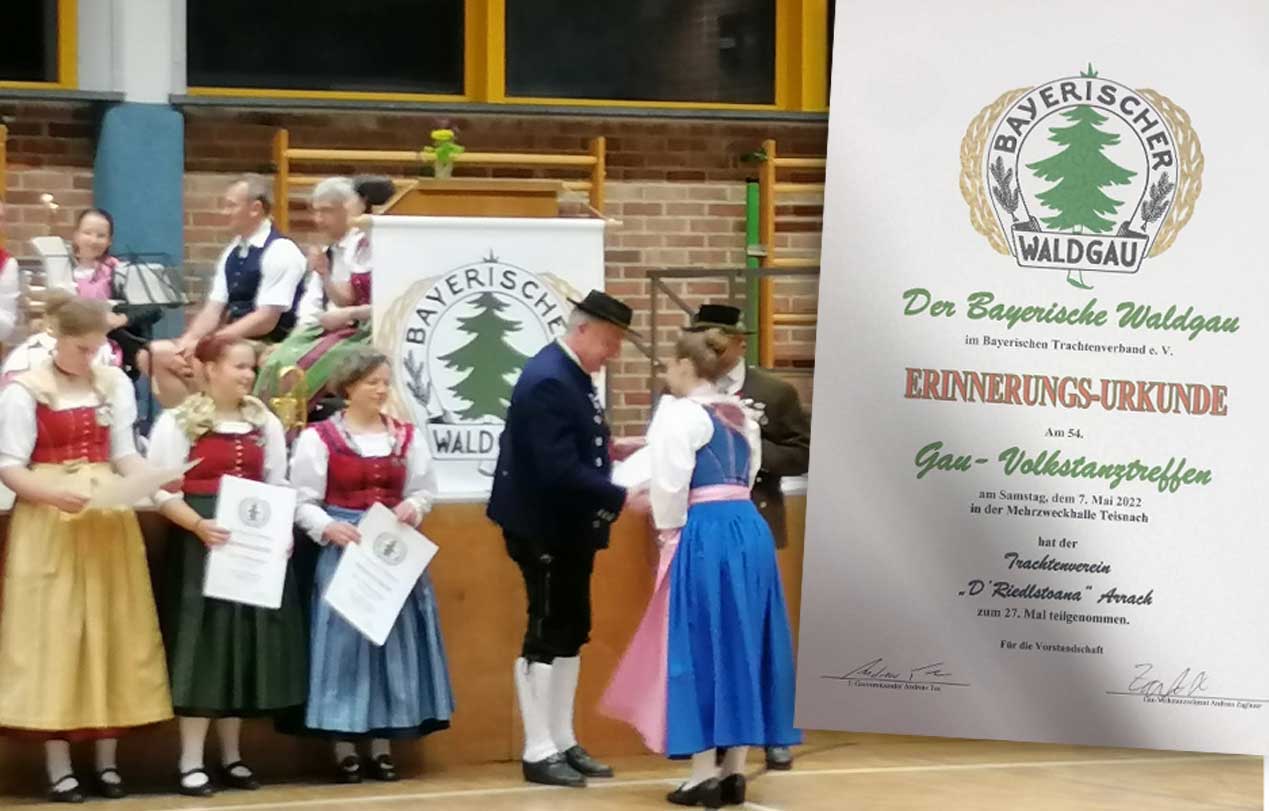 Unser Verein hat mit 9 Tanzpaaren beim Volkstanztreffen des Bayerischen Waldgaus in Teisnach zum 27. Mal teilgenommen. Den Volkstanz: die Kreuzpolka haben wir getanzt.